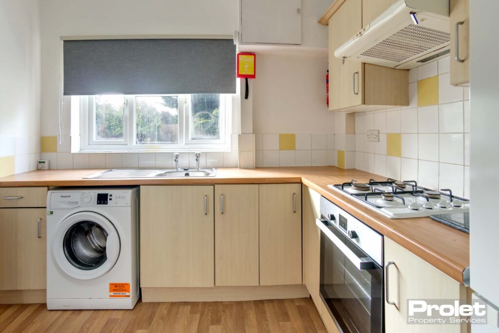 Fitted kitchen with built in oven, gas hob, washing machine and fridge freezer.