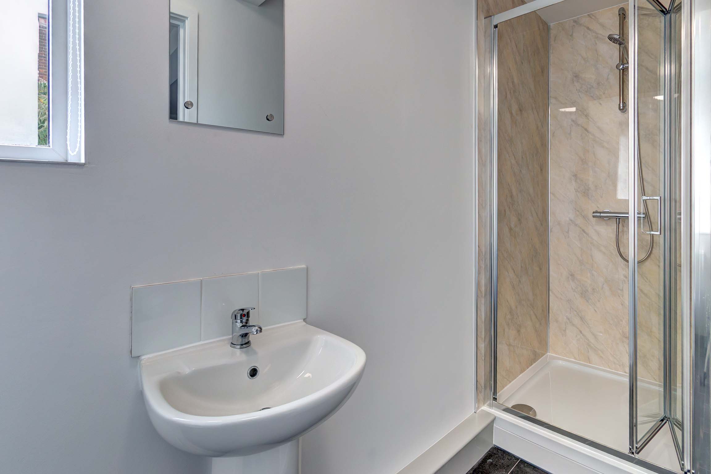 The Pavilion itself is a modern five bed property with individual rooms, four of which are en-suite. The shared kitchen/living space is sleek, with large work stops and plenty of cupboard space. There is also a dining table and chairs, and a wall mounted TV making it a great place to socialise. Doors from the kitchen lead out onto the balcony, which comes with outdoor furniture and a covering, so it is a great outdoor space even in the rain. The property has a secure side entrance and bike storage is available to the rear.